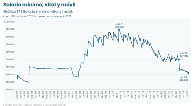 Esta tendencia decreciente llevó el valor real del SMVM en octubre de 2025 a ubicarse en un nivel inferior al registrado en el año 2001, antes del colapso de la convertibilidad.