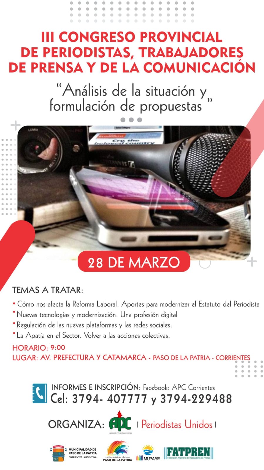 La Asociación de Periodistas de Corrientes, organiza el 3er Congreso Provincial de Periodistas, Trabajadores de Prensa y de la Comunicación en Paso de la Patria el próximo sábado 28 de marzo desde las 9 de la mañana, a la cual están convocados todos aquellos obreros que se dediquen a la difusión masiva de mensajes.