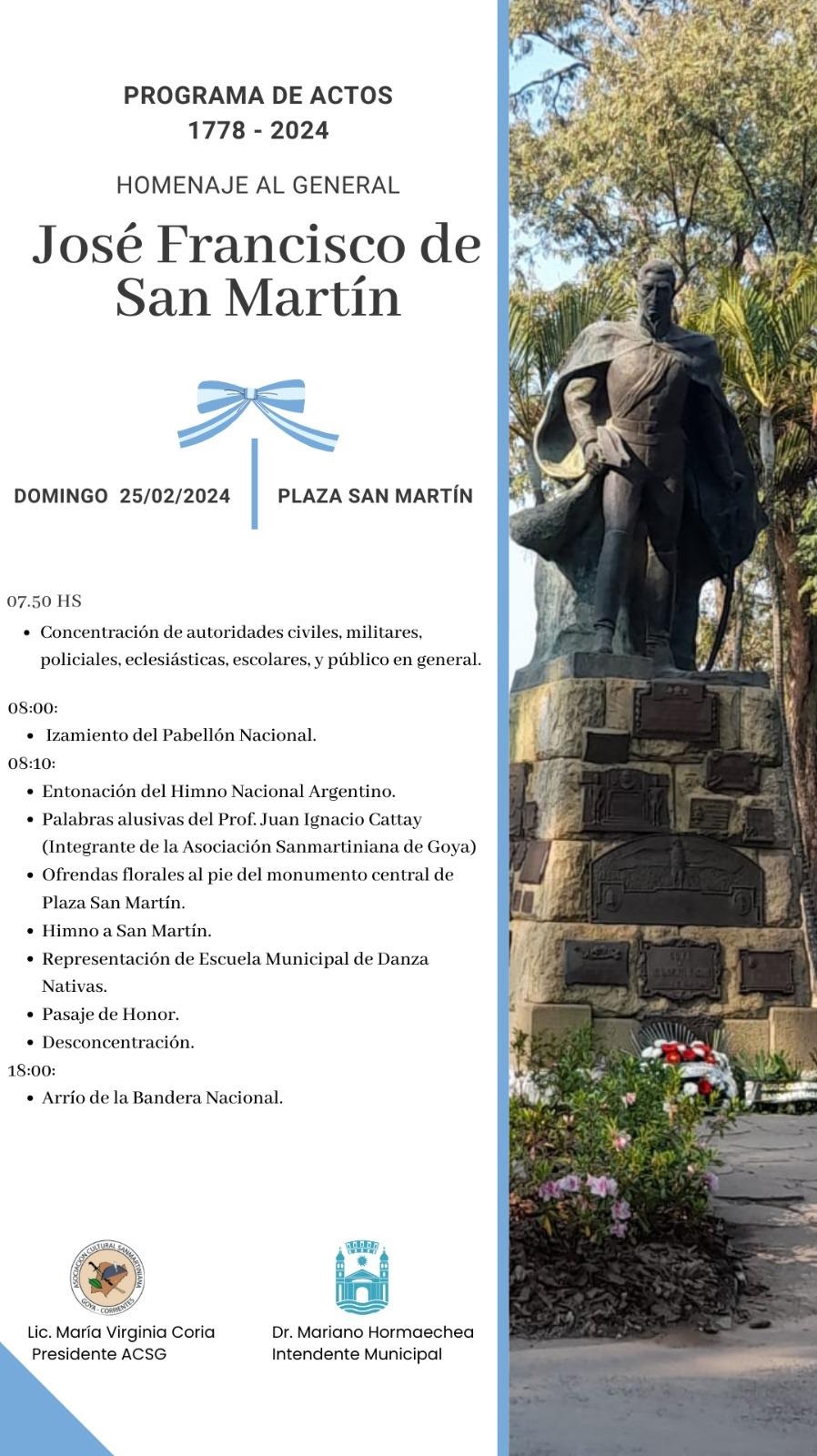 La Municipalidad de Goya y la Asociación Cultural Sanmartiniana invitan a la comunidad a participar del acto conmemorativo por el 246º Aniversario del Natalicio del Padre de la Patria, a realizarse este domingo 25 de febrero desde las 8 horas en la plaza que perpetúa la memoria del prócer de América.
