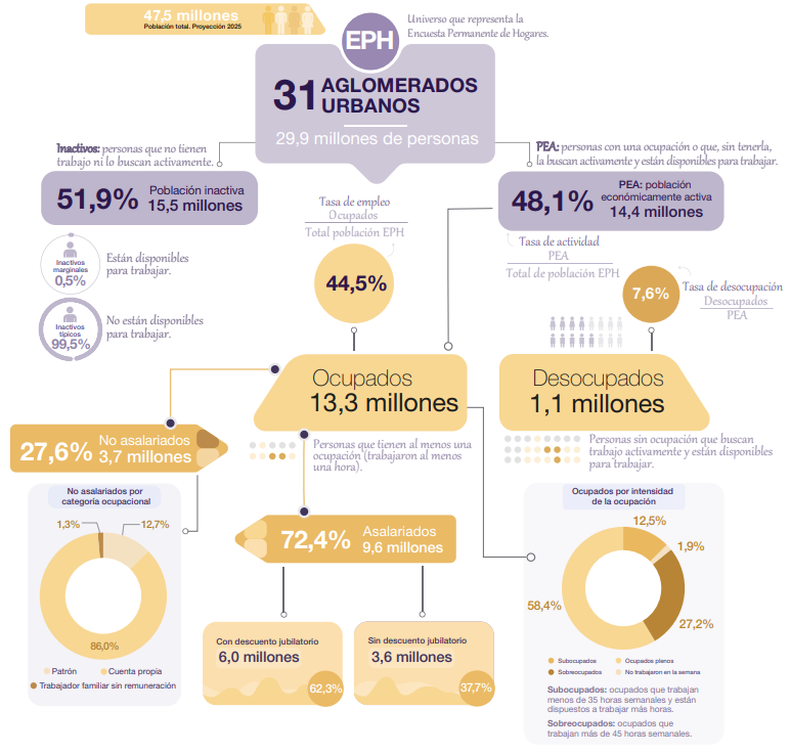 En relación con la población ocupada, el informe reveló que la informalidad alcanzó al 43,2%. De los ocupados, el 72,4% corresponde a asalariados, pero de ellos un 37,7% no cuenta con descuento jubilatorio, es decir, se desempeña en condiciones informales. Dentro de ese grupo, un 15,7% realiza aportes propios. En tanto, el 23,7% de la población ocupada trabaja por cuenta propia, un 3,5% se identifica como patrón y un 0,4% lo hace como trabajador familiar sin remuneración.