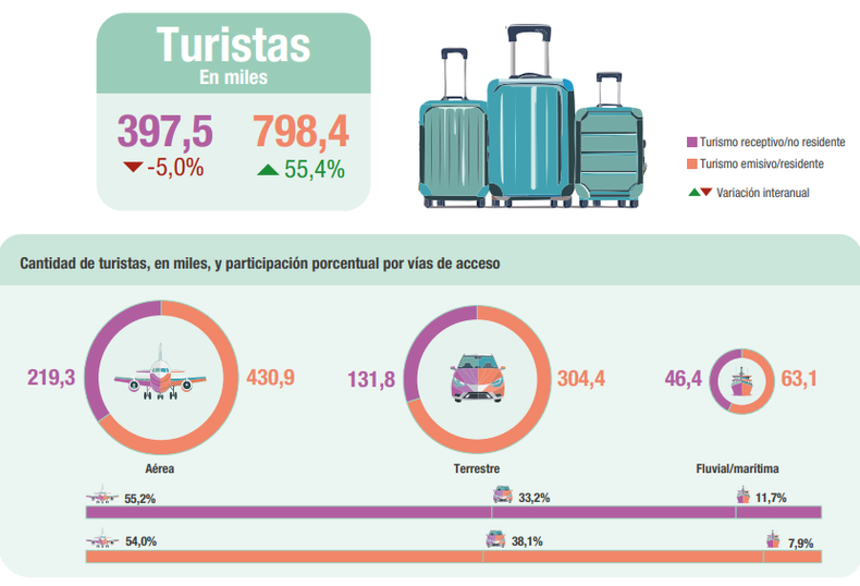 En total, 1,36 millones de argentinos viajaron al exterior durante el mes, de los cuales 798,4 mil fueron turistas y 562,8 mil excursionistas. En contraste, ingresaron 664,5 mil visitantes no residentes, entre ellos 397,5 mil turistas y 267 mil excursionistas. El saldo negativo fue de 696,7 mil personas.