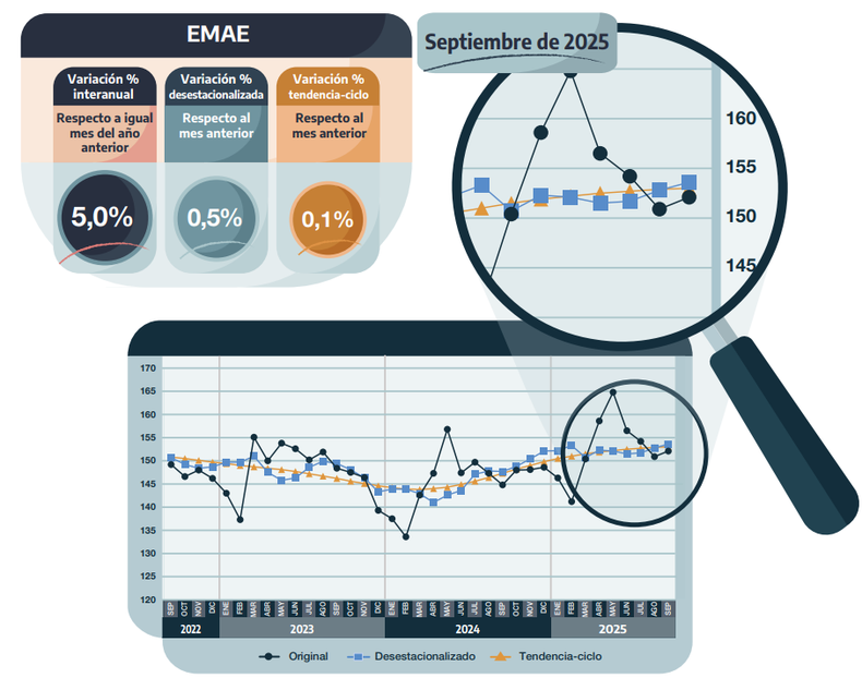 En septiembre de 2025, el estimador mensual de actividad económica (EMAE) registró una suba de 0,5% respecto a agosto y un 5,0% en la comparación interanual (ia), según informó el Instituto Nacional de Estadística y Censos (Indec) este martes.