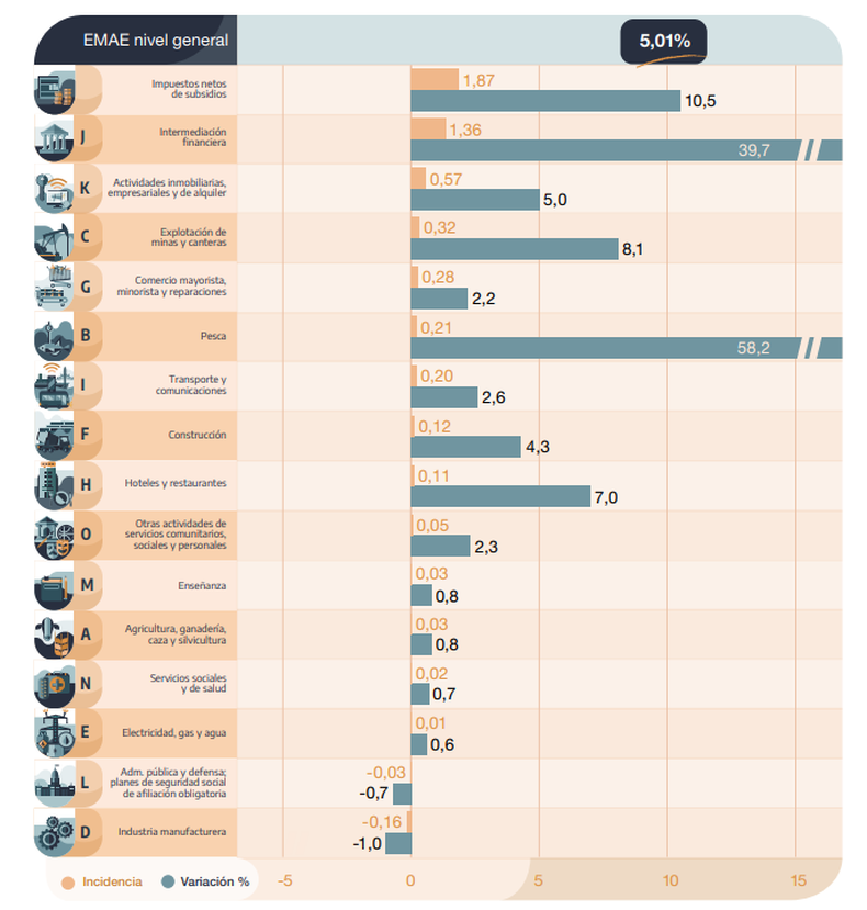 Este último sector no solo creció con fuerza, sino que se convirtió en el principal motor del EMAE. Su impacto fue decisivo para la variación general, seguido por Actividades inmobiliarias, empresariales y de alquiler, que mejoraron 5%.