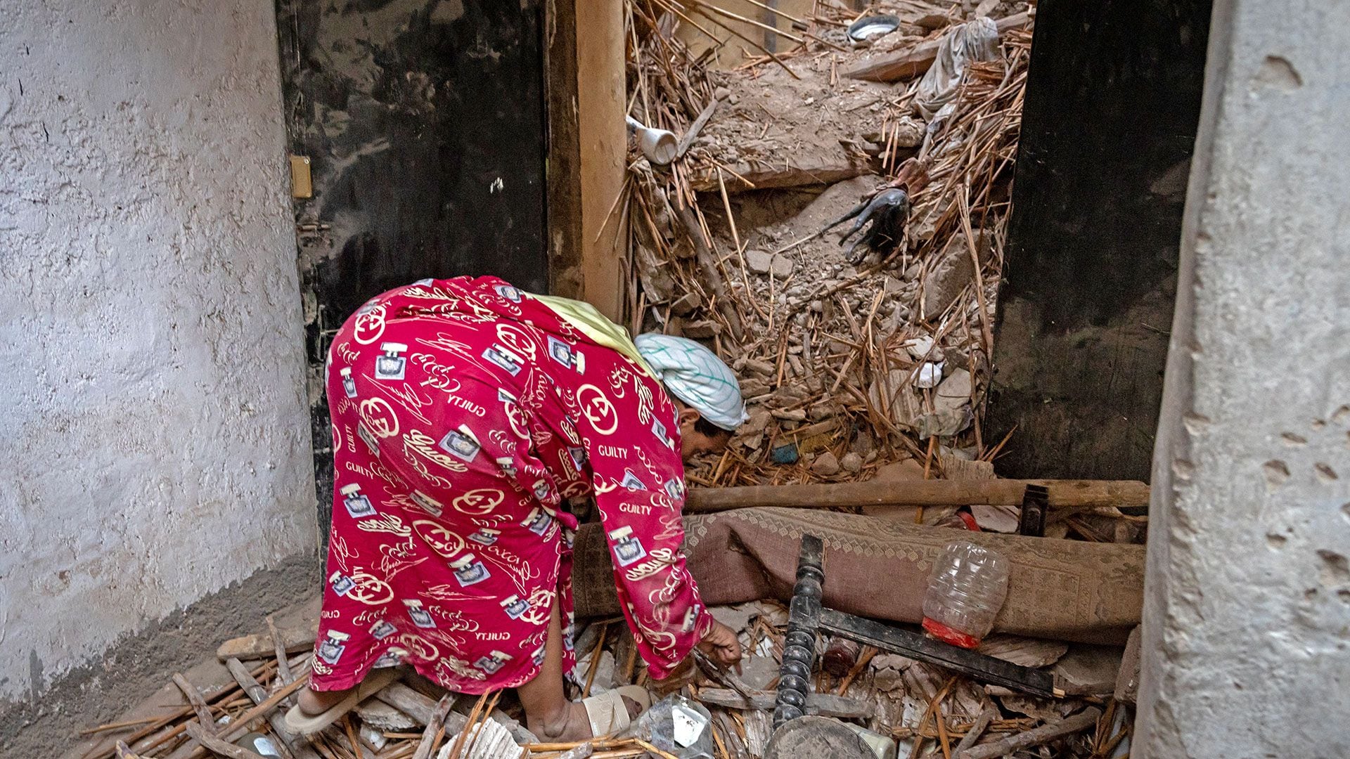Una mujer busca entre los escombros