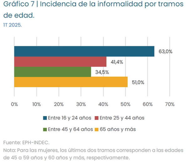 La desigualdad también se refleja en términos de género y edad. Durante el primer trimestre del año, la informalidad femenina promedió 43,2%, frente a 41,1% en los hombres. Entre los jóvenes de 16 a 24 años, la tasa se dispara al 63%, lo que implica que seis de cada diez ocupados en ese rango etario trabajan sin derechos básicos garantizados.