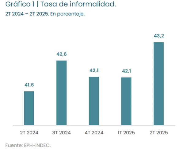 La economía argentina enfrenta un desafío estructural que se agudizó en el segundo trimestre de 2025: la tasa de informalidad laboral llegó al 43,2%, el nivel más alto desde el mismo período de 2024. Así lo señaló el informe elaborado por el Área de Empleo, Distribución e Instituciones Laborales (EDIL), dependiente del Instituto Interdisciplinario de Economía Política de la UBA y el Conicet.
