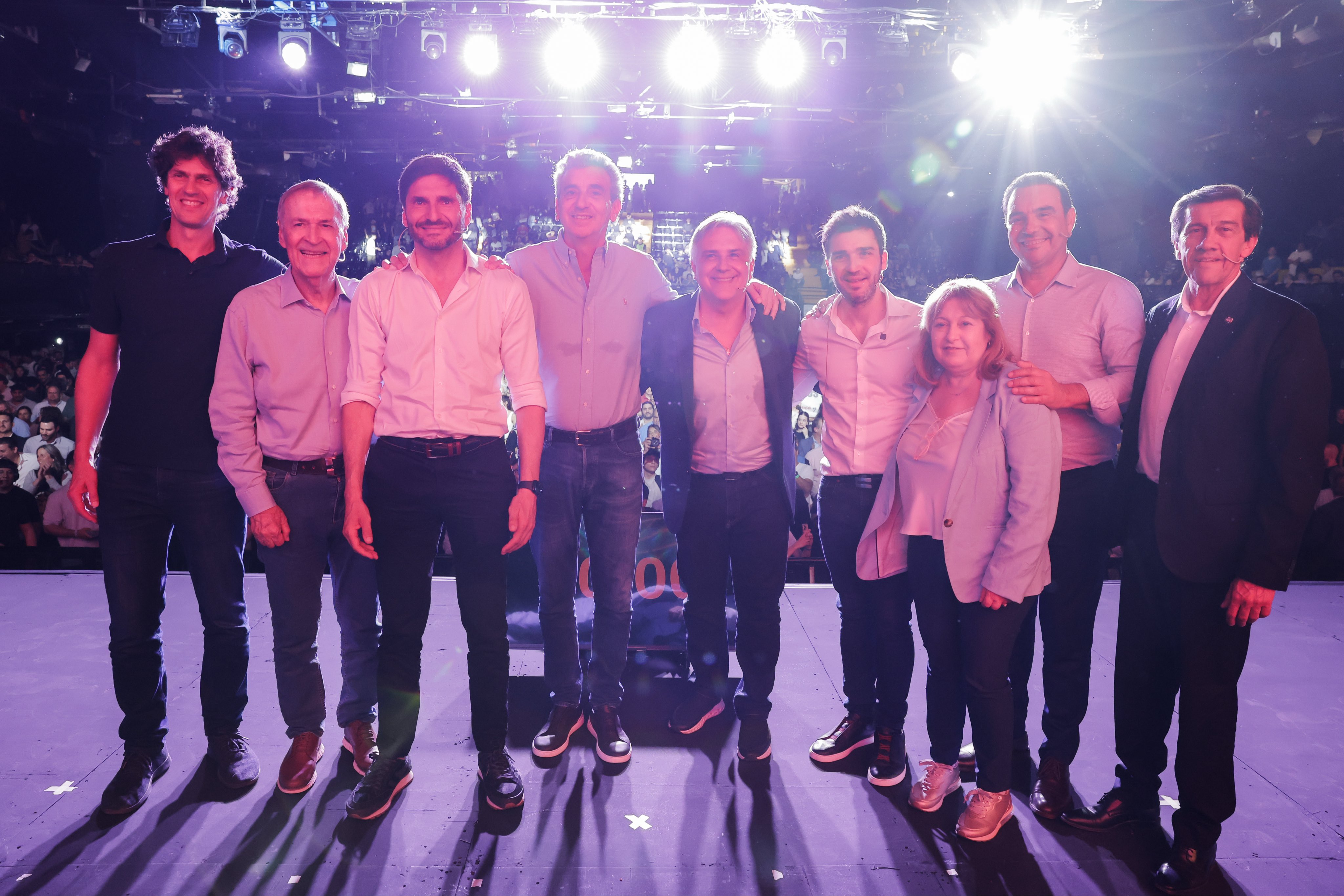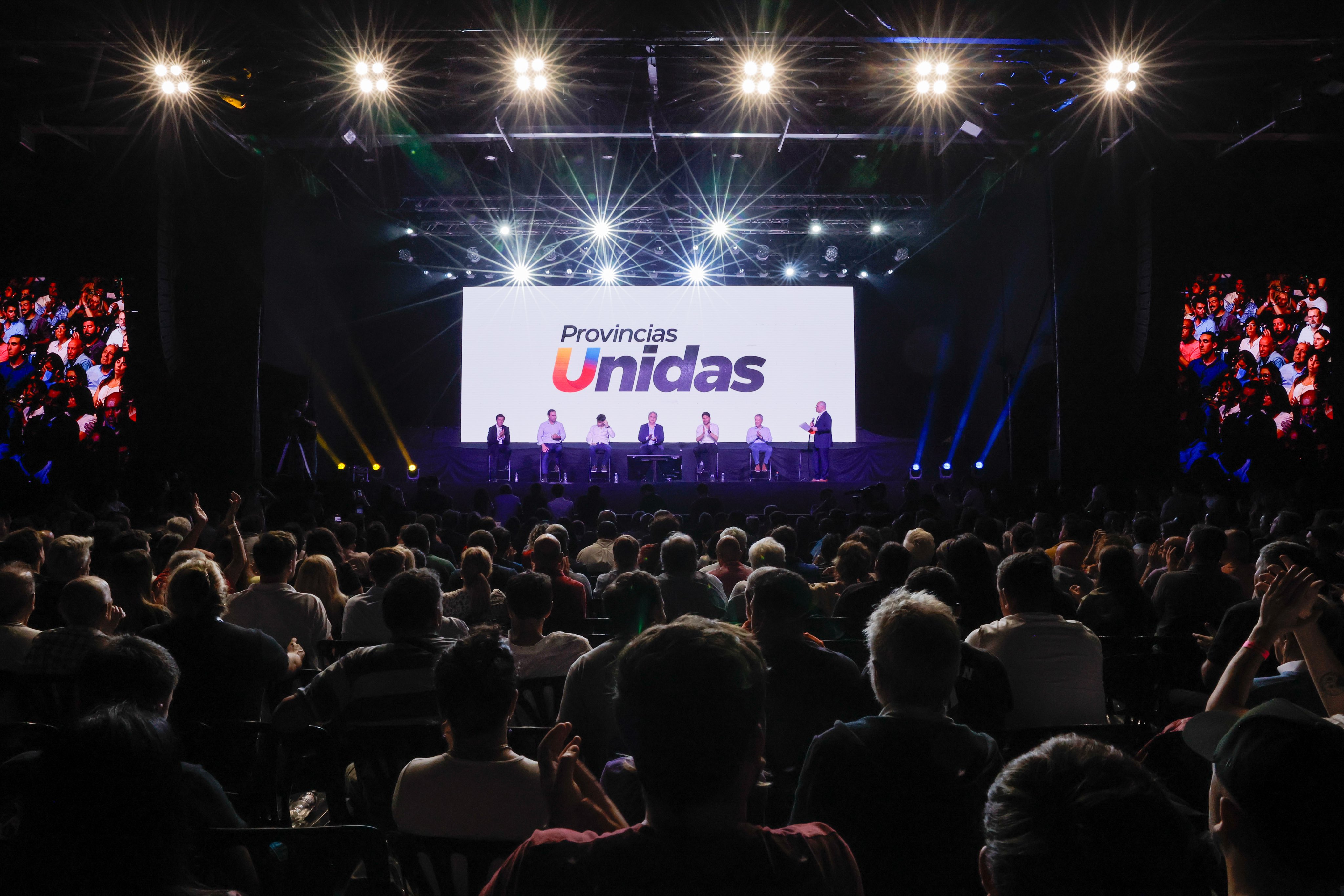 Seguidamente se invitó al escenario a los cinco gobernadores que conforman “Provincias Unidas”: por Corrientes, Gustavo Valdés; por Jujuy, Carlos Sadir; Chubut, Ignacio “Nacho” Torres; por Córdoba, Martín Llaryora; Santa Fe, Maximiliano Pullaro; y al ex gobernador de Córdoba y candidato a diputado nacional por esa provincia, Juan Schiaretti. Cabe aclarar que el gobernador de Santa Cruz, Claudio Vidal, que también integra el espacio, no pudo asistir.