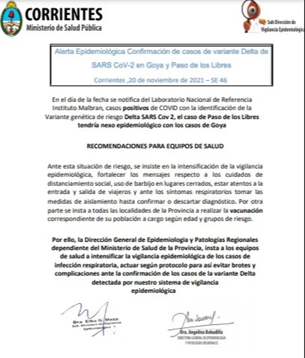 El documento falso asegura en su último párrafo que "la Dirección General de Epidemiología y Patologías Regionales dependiente del Ministerio de Salud de la Provincia, insta a los equipos de salud a intensificar la vigilancia epidemiológica de los casos de infección respiratoria, actuar según protocolo para evitar así brotes y complicaciones ante la confirmación de la circulación de la variante Delta detectada por nuestro sistema de vigilancia epidemiológica".