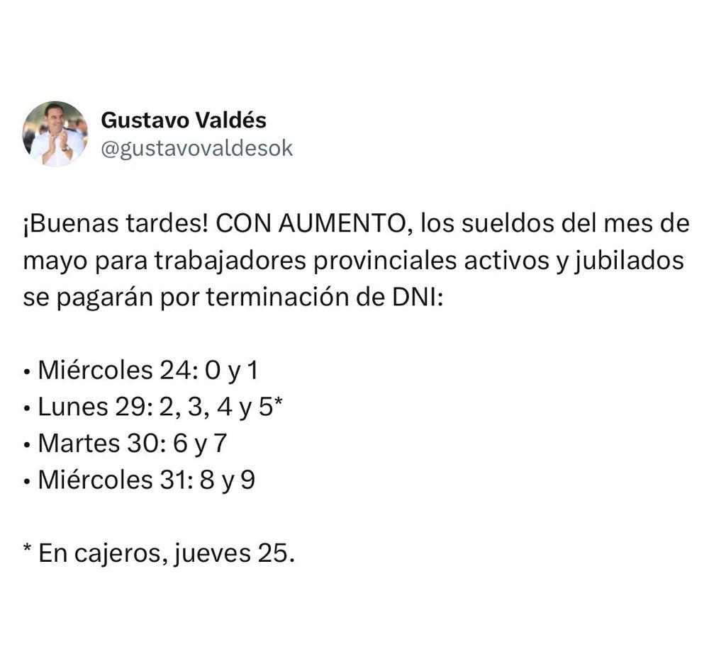 A través de su cuenta de Twitter, el gobernador Gustavo Valdés anunció los días de pago de sueldos para los trabajadores de la administración pública provincial, tanto activos como pasivos.