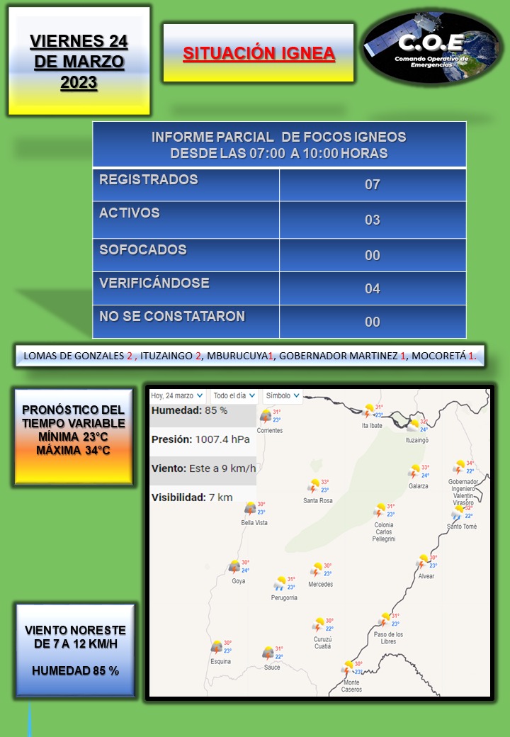 El Comando Operativo de Emergencias (COE) de la provincia de Corrientes informó este jueves 23 de marzo, que en las últimas horas se registraron 5 focos de incendio, de los cuales 2 se encuentran activos, 2 en observación y 1 sofocado.