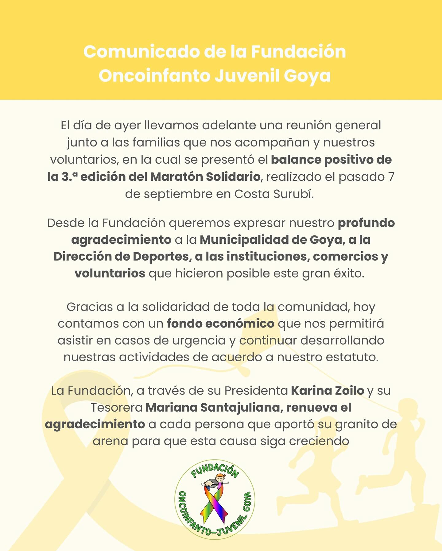 Agradece el apoyo y acompañamiento de la Municipalidad de Goya, de la Dirección de Deportes, a los voluntarios, atletas, empresas, instituciones y comercios de la ciudad.