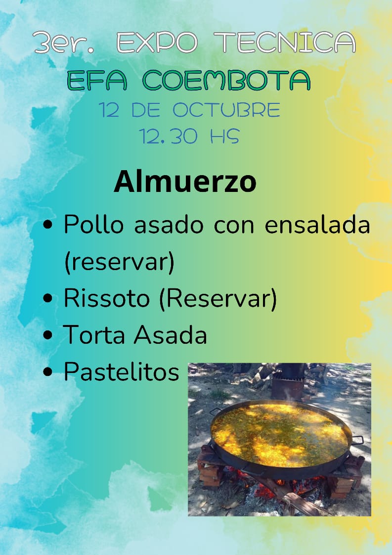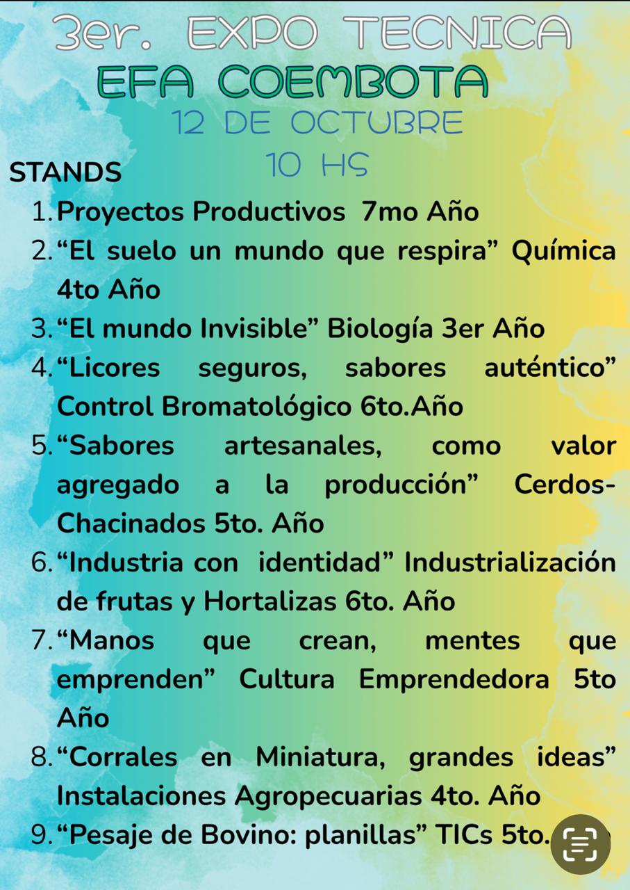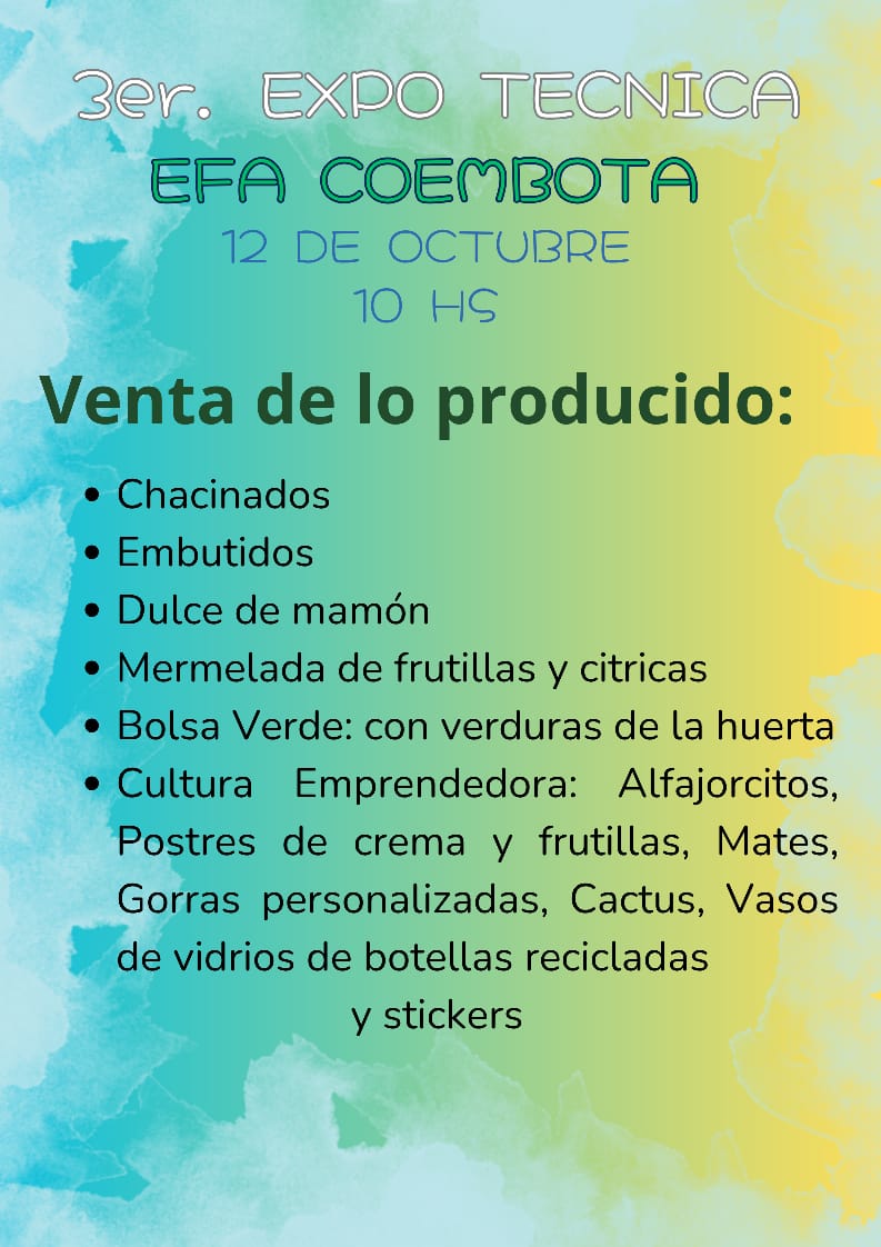 El equipo de coordinadores de la Escuela de la Familia Agrícola, EFA COEMBOTA, invita para este domingo 12 de octubre a vivir la experiencia de la 3ª Jornada Expo Técnica. Se podrá conocer el trabajo de investigación de los alumnos y venta de productos de esa comunidad educativa rural. El evento iniciará a las 10 de la mañana.