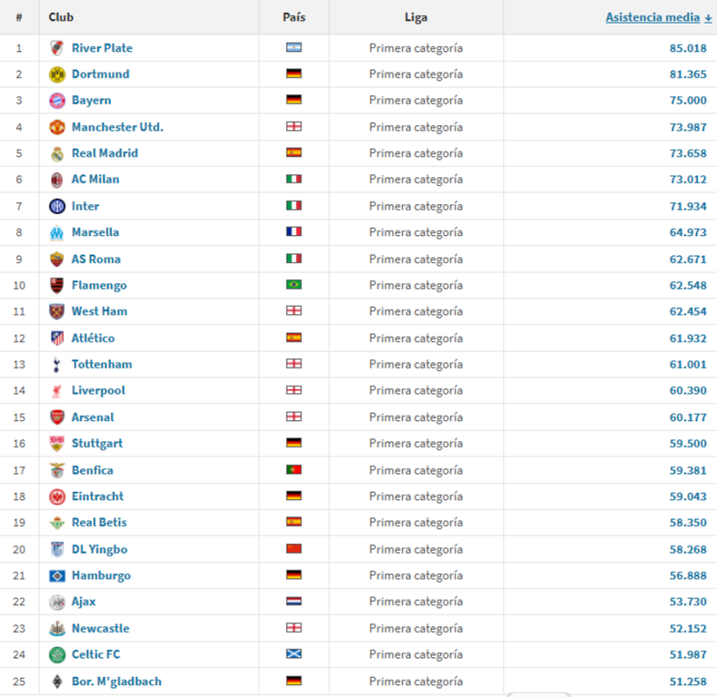 Los datos marcan que el Millonario lidera la tabla con un promedio de asistencia por partido de 85.018 espectadores, seguido por Borussia Dortmund con 81.365 y por Bayern Múnich, que completa el podio, con 75.000.