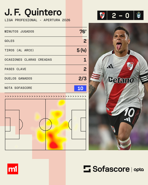River sigue mostrando mejoras respecto al pálido 2025 y este miércoles sumó su segunda victoria, de la mano de Juan Fernando Quintero, por 2-0 ante Gimnasia y Esgrima La Plata, en el marco de la segunda fecha del Torneo Apertura 2026 de la Liga Profesional de Fútbol.