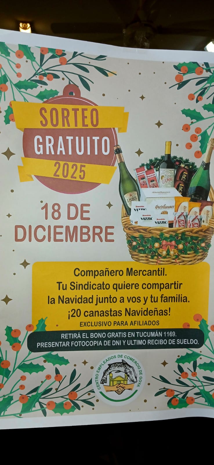 El día de mañana, jueves 18 de diciembre se realizará el sorteo gratuito de 20 canastas navideñas, exclusivo para afiliados, en instalaciones del gremio, sito en calle tucuman n° 1169, a partir de las 10 hrs, por bolillero propio.