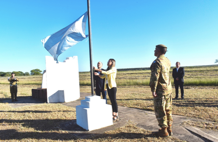 El acto dio inicio con el izamiento del Pabellón Nacional, a cargo del intendente municipal de Goya Mariano Hormaechea, la Presidente HCD del municipio de Carolina, Leticia Luzarraga, y el 2do Jefe del Batallón de Monte 12, Mayor Guillermo González. El izamiento estuvo acompañado por el Toque de Bandera con Trompa a cargo del Sargento Daniel González del Batallón con asiento en la ciudad de Goya.