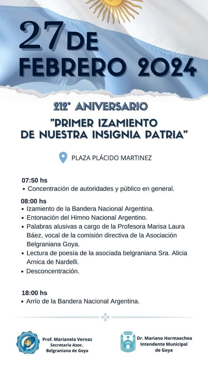 La Municipalidad de Goya y la Asociación Belgraniana invitan al acto recordatorio a realizarse este martes 27 de febrero a las 8 horas en Plaza Plácido Martínez.
