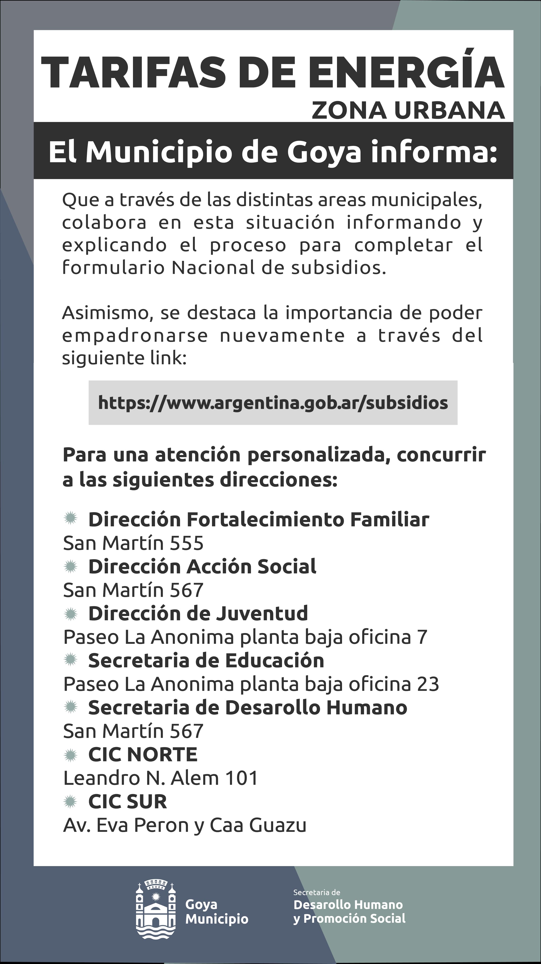 El Municipio de Goya comunicó que en virtud de la situación de las tarifas de energía eléctrica y en pos de contribuir con la ayuda a los usuarios, desde el municipio se implementan acciones tendientes al asesoramiento o atenciones personalizadas para las recomendaciones correspondientes, explicando el proceso para completar el formulario Nacional de subsidios.