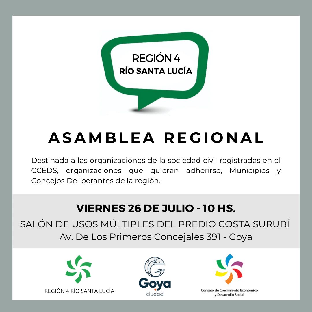 En la Región 4 Río Santa Lucía se convoca a una importante Asamblea General que se llevará a cabo el viernes 26 de julio a las 10 de la mañana en el Salón de Usos Múltiples de Costa Surubí, ubicado en la Avenida Primeros Concejales 391 de la ciudad. Este encuentro regional está dirigido a las organizaciones de la sociedad civil registradas en el Consejo de Crecimiento Económico y Desarrollo Social (CCEDS) así como a aquellas que deseen unirse, a los Municipios y al Concejo Deliberante de la Región.