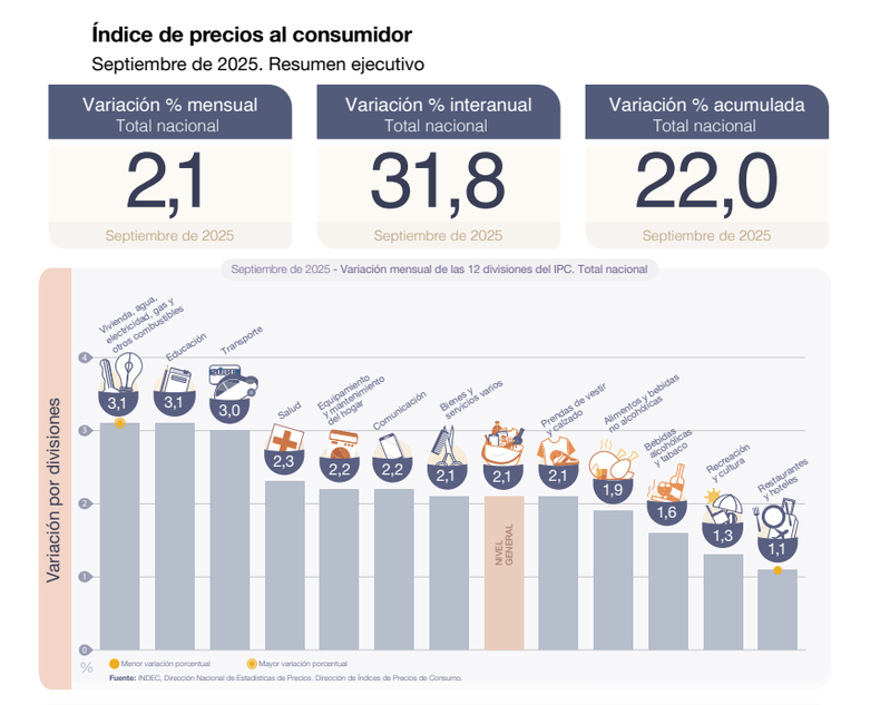 El Instituto Nacional de Estadística y Censos (Indec) informó este martes que la inflación de septiembre fue del 2,1%, mostrando un incremento de 0.2 en comparación al mes de agosto. El acumulado en los primeros 9 meses del año llegó al 22,0%. En la comparación interanual, el Índice de Precios al Consumidor (IPC) mostró un incremento del 31,8%, consolidando una tendencia de desaceleración frente a los picos registrados en 2024.
