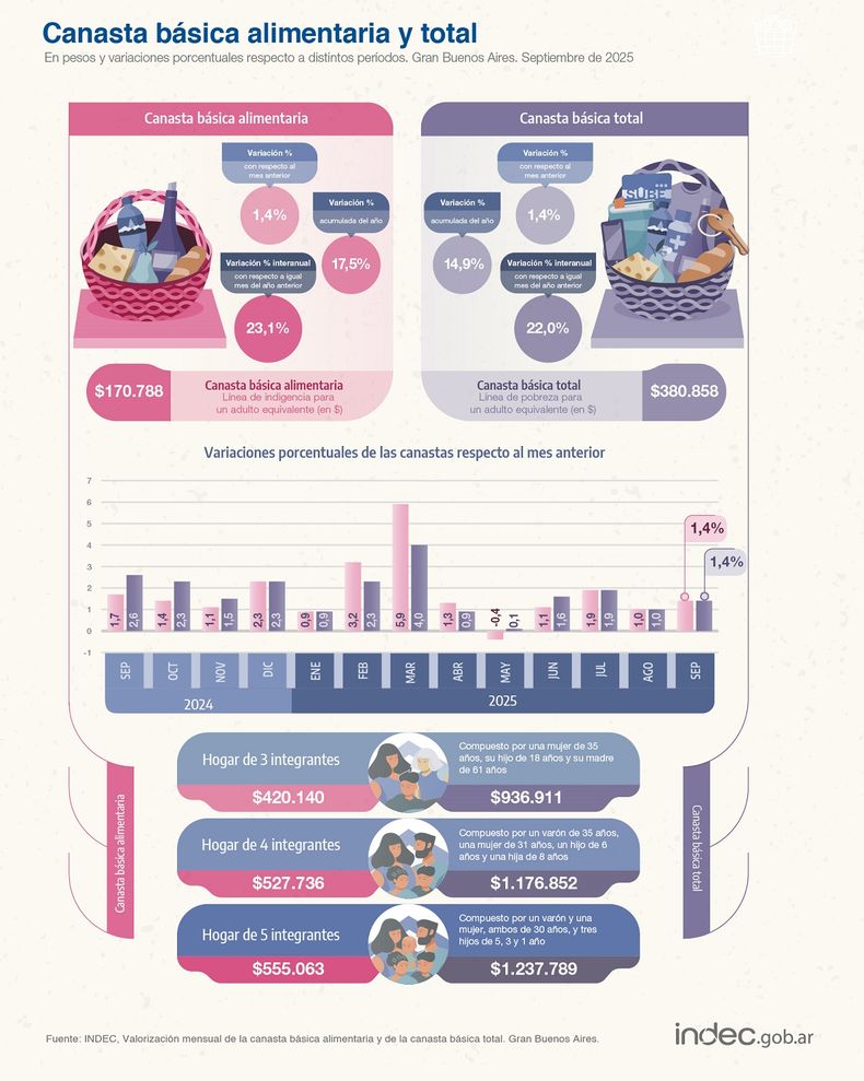 El Instituto Nacional de Estadística y Censos (Indec) informó que una familia tipo requirió ingresos en septiembre por al menos $1.176.852 para no ser pobre, lo que representa un aumento del 1,4% con respecto al mes anterior y del 22% en la comparación interanual. Además, necesitó al menos $527.736 para no caer en la indigencia.