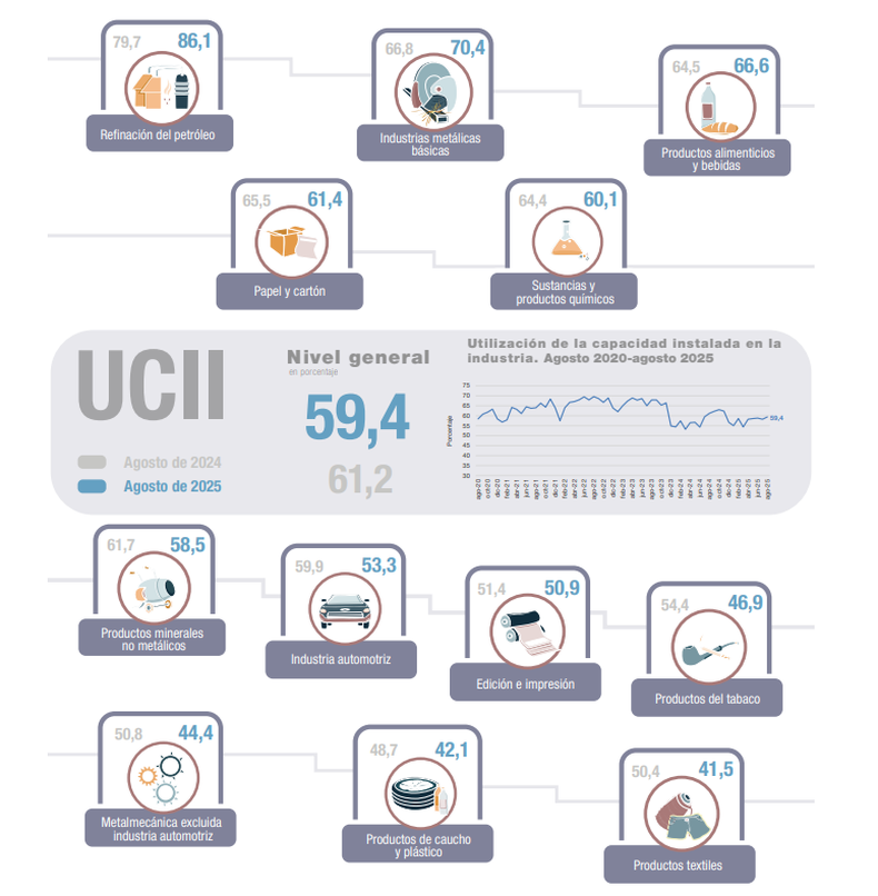 La utilización de la capacidad instalada en la industria se ubicó en 59,4 % en agosto, informó este el Instituto Nacional de Estadística Censos (INDEC). La cifra es inferior a la del mismo mes de 2024, que fue de 61,2 %, y levemente superior a la de julio del 2025, que fue del 58,2%.