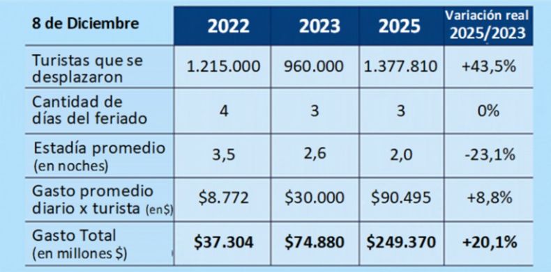 El número de turistas que se movilizó durante el fin de semana largo por el Día de la Inmaculada Concepción creció 43,5% frente al mismo período de 2023, teniendo en cuenta que en 2024 no hubo feriado.
