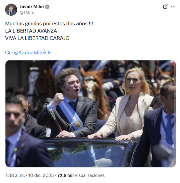 Para graficar la celebración de sus primeros dos años de mandato, Milei optó por elegir una foto del día de su asunción, el 10 de diciembre de 2023, cuando estuvo acompañado por su hermana y secretaria general de la Presidencia, Karina Milei, a quien mencionó en el posteo.