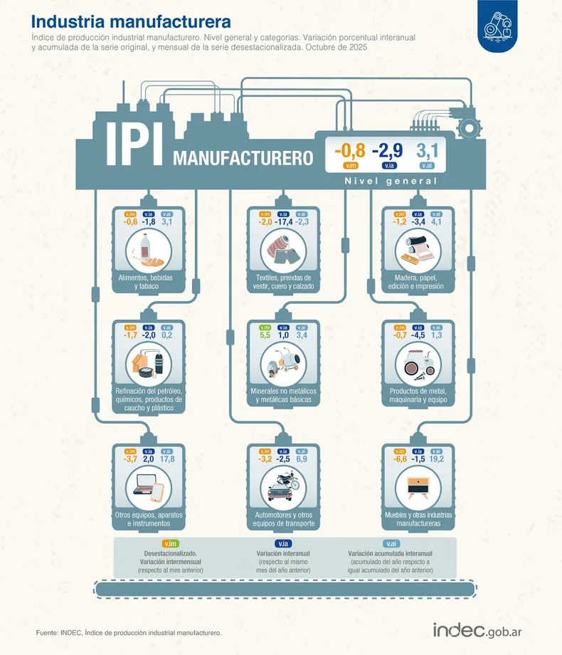 El Instituto Nacional de Estadística y Censos (Indec) expuso que el índice de producción industrial manufacturero cayó un 2,9% interanual en octubre, mientras que bajó un 0,8% en comparación con septiembre. De esta manera, tocó su peor nivel desde marzo y se ubicó un 5% por debajo de la máxima actividad registrada durante el gobierno de Javier Milei.