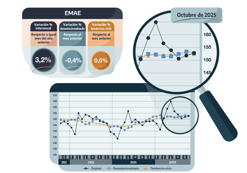 En contrapartida, tres sectores mostraron caídas frente a octubre de 2024. La industria manufacturera encabezó las bajas, con un retroceso del 2,7%, seguida por la administración pública y defensa (-0,8%) y hoteles y restaurantes (-1,0%). En conjunto, estas ramas restaron 0,52 puntos porcentuales a la variación interanual del EMAE.