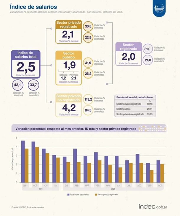 Según el Índice de Salarios del INDEC, el salario registrado, que incluye a trabajadores del sector público y privado formal, aumentó 2% en octubre, pero volvió a ubicarse por debajo de la inflación del mes, que fue del 2,3%.