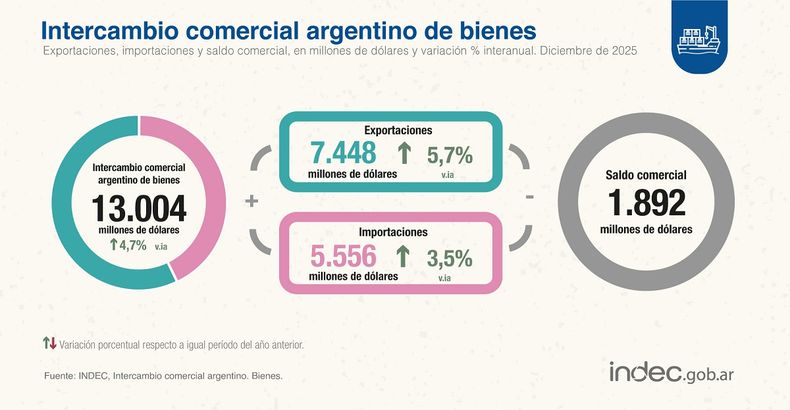Durante 2025, las exportaciones alcanzaron los u$s87.077 millones (suba de 9,3% contra mismo período de 2024), las importaciones los u$s75.791 millones (suba de 28,9%) y un saldo total por u$s11.286 millones.