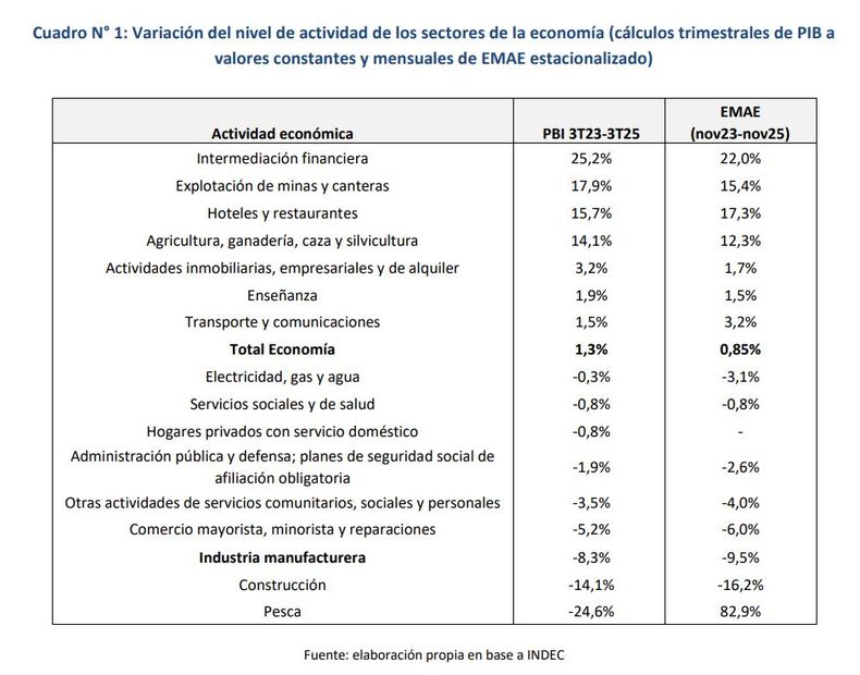 En el reporte se advierte el desplome del coeficiente de industrialización. En apenas dos años, la participación de las fábricas en el Producto Bruto Interno (PBI) se hundió del 16,5% al 13,7%. Este indicador no es solo una cifra estadística: representa un retroceso a niveles previos a la Segunda Guerra Mundial, borrando de un plumazo décadas de desarrollo productivo. Mientras sectores como la intermediación financiera y la minería muestran crecimientos exponenciales, la industria se desangra junto a la construcción. De las 24 ramas manufactureras del país, 22 redujeron su actividad en el último bienio.