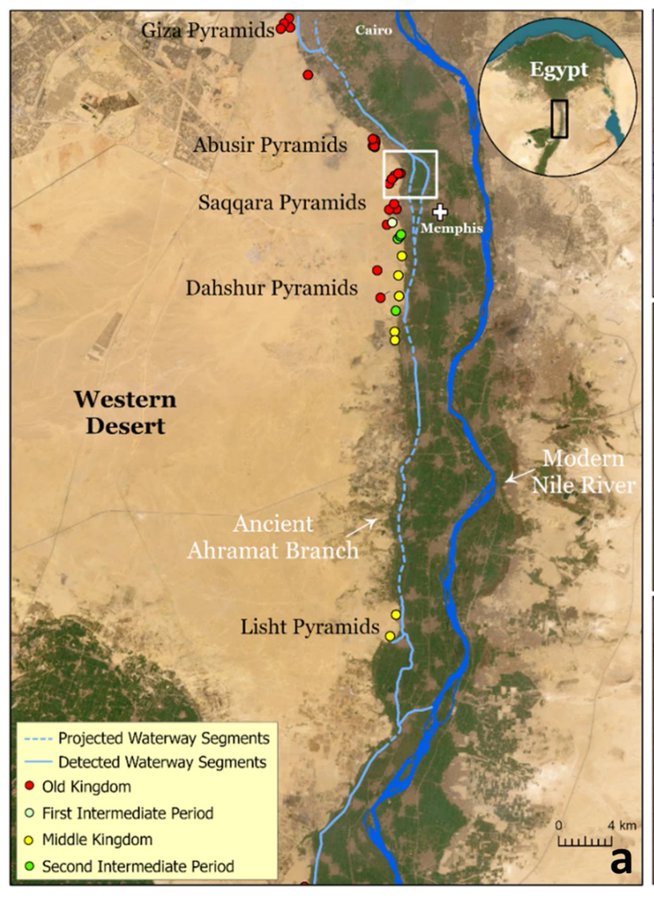 No obstante, mediante el análisis de imágenes satelitales, datos geofísicos y muestras del suelo profundo, expertos dirigidos por Ghoneim descubrieron un antiguo y extenso brazo del río Nilo, ya extinto, que parece conectar todas las pirámides en esta región y podría haber sido utilizado para mover trabajadores y enormes materiales destinados a su construcción. "Nuestra investigación ofrece el primer mapa de una de las principales ramas antiguas del Nilo a tan gran escala y lo vincula con los campos piramidales más grandes de Egipto", afirma Ghoneim.