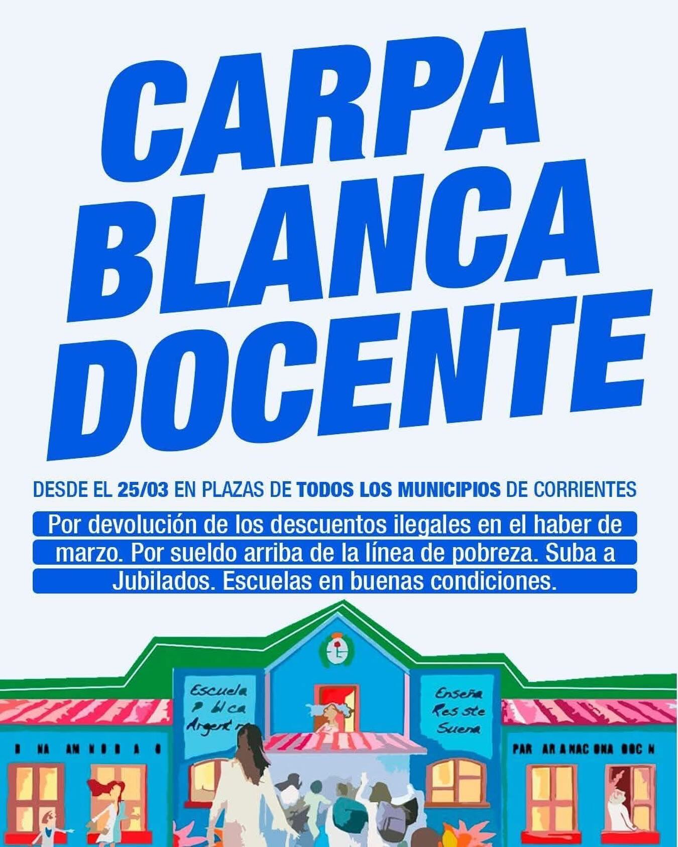 En paralelo a las movilizaciones de autoconvocados, el Sindicato Único de Trabajadores de la Educación de Corrientes (SUTECO) anunció que desde el miércoles 25 de marzo comenzarán a instalar carpas blancas docentes en las plazas de todos los municipios de la provincia, como parte de un plan de lucha que también incluirá presentaciones administrativas y judiciales para exigir la devolución de los montos descontados.