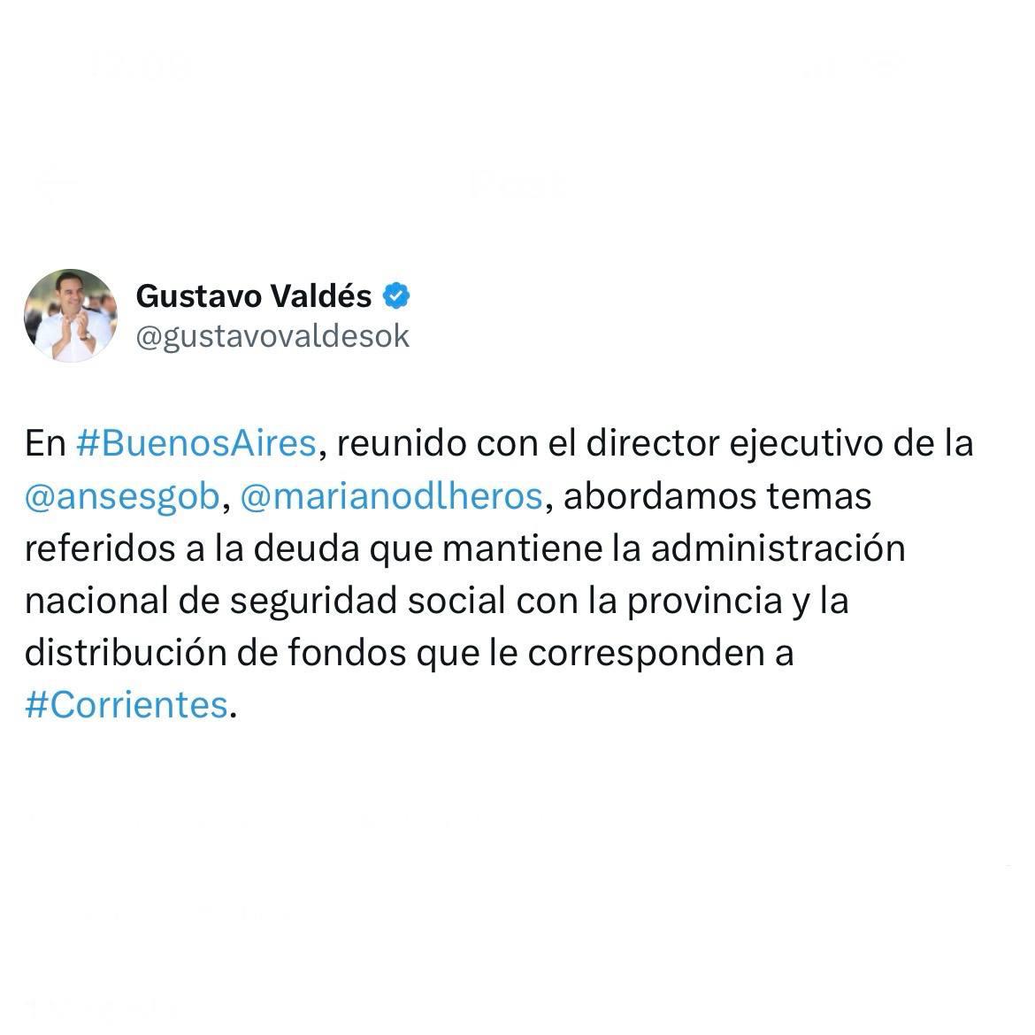 Este miércoles el gobernador Gustavo Valdés mantuvo un encuentro con el director ejecutivo de la Anses, Mariano A. S. de los Heros donde abordaron cuestiones referidos a la distribución de fondos que le corresponden a Corrientes.